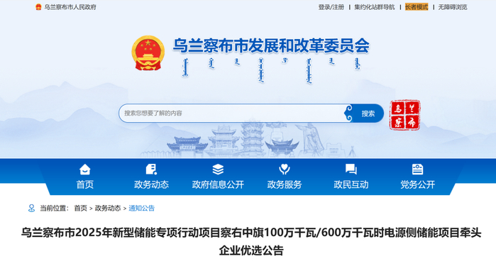 储能与电力市场获悉,近日,内蒙古乌兰察布发改委发布乌兰察布市2025年新型储能专项行动项目察右中旗100万千瓦/600万千瓦时电源侧储能项目牵头企业优选公告。