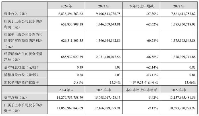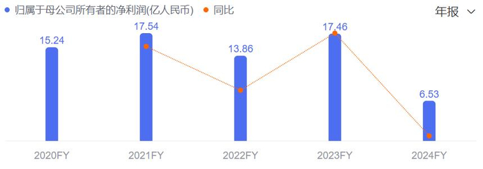 不仅如此,汤臣倍健的归母净利润也出现了明显下滑,由2023年的17.46亿元骤降至2024年的6.53亿元,降幅62.62%,近乎“膝斩”;扣非后净利润降至6.26亿元,较2023年同期的15.97亿元下降60.78%。