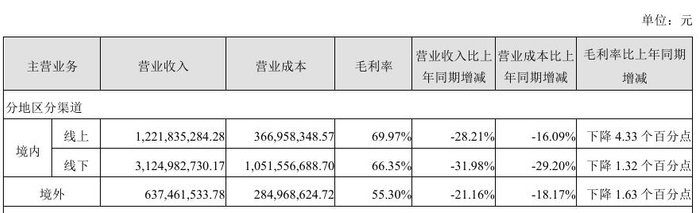 2024年,汤臣倍健的境内的线上渠道毛利率下滑4.33个百分点至69.97%,大有通过让利换取增长的势头。然而,该渠道过去一年的销售收入约34.18亿元,仍旧无法与线下渠道拉开差距,且出现了29.79%的下滑。
