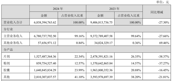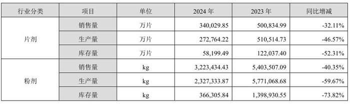 分产品来看,2024年汤臣倍健片剂、粉剂的销售金额分别为15.27亿元和8.60亿元,销售量分别为34万片和322.34kg,上述指标的降幅均超过30%,主要系核心产品迭代导致销售减少、该公司结合销售情况调整生产及库存所致。