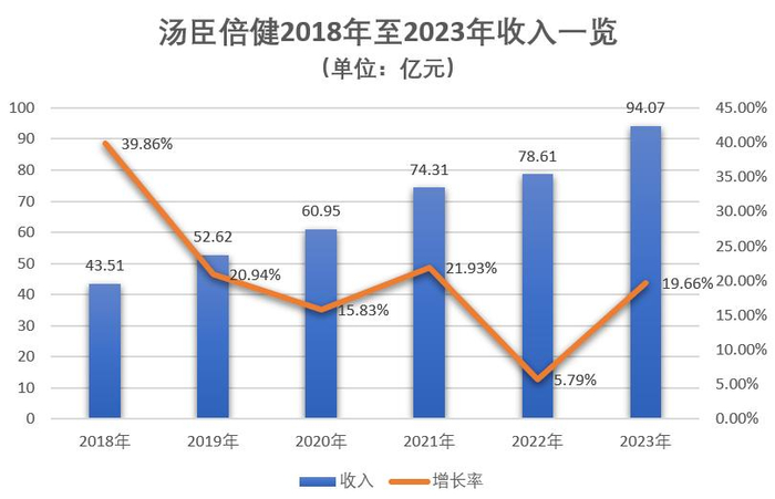 自2010年登陆A股市场以来,汤臣倍健的业绩便持续保持稳健增长态势。特别是在2019年突破50亿元收入大关后,该公司的收入更是呈几何级增长,由2019年的52.62亿元增至2023年的94.07亿元,离百亿规模仅一步之遥。