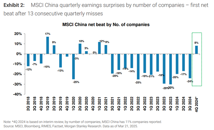 财报表现超出预期:MSCI中国公司出现3年半以来首次净业绩超预期,4Q24财报显示8%的净超预期(按公司数量和加权盈利计算),结束了连续13个季度的业绩失望。