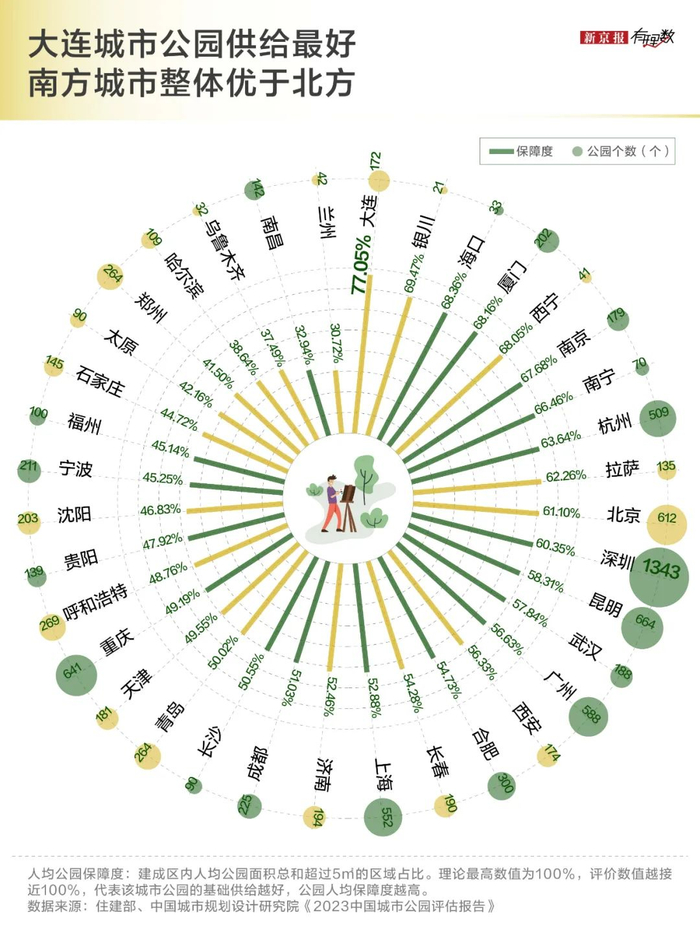 从数量上来看,深圳毫无疑问是王者,但要考虑城市公园服务的人群数量、逛公园的舒适度,仅看数量是不够的。有研究机构提出了人均公园保障度的概念,即人均公园面积总和超过5平方米的区域占整个建成区的比例。