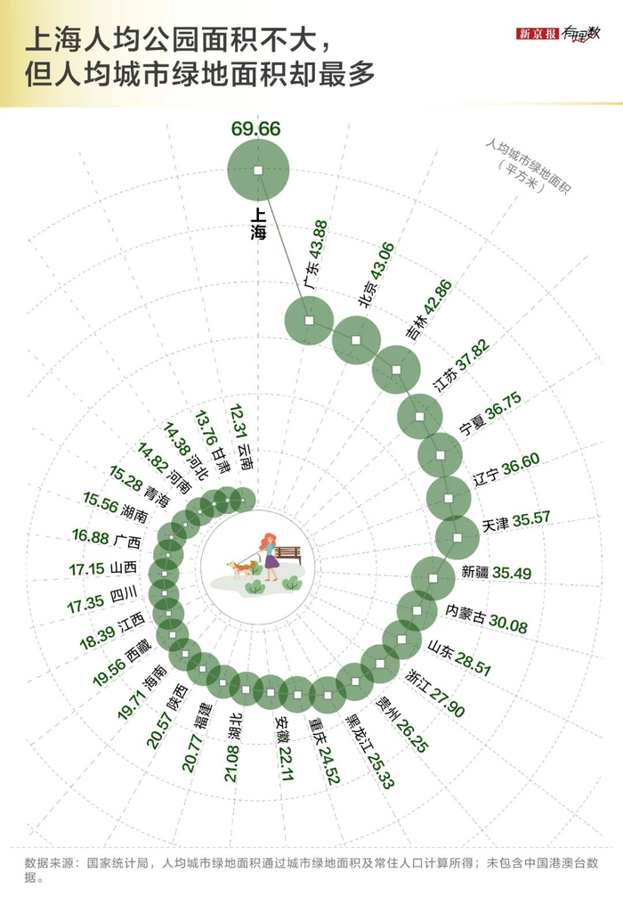 而垫底的上海,人均公园面积仅1.79平方米,相当于半个麻将桌大小。若将全市552个公园铺满外滩,每平方米需站1.2人。