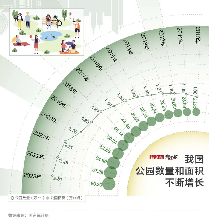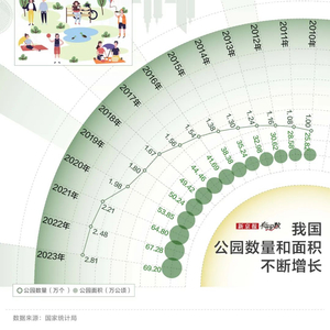 从2010年到2023年,我国城市公园的数量几乎以每年1400个的速度快速增长,公园面积也以每年3万公顷的速度增长,到2023年,公园数量几乎是2010年的3倍。