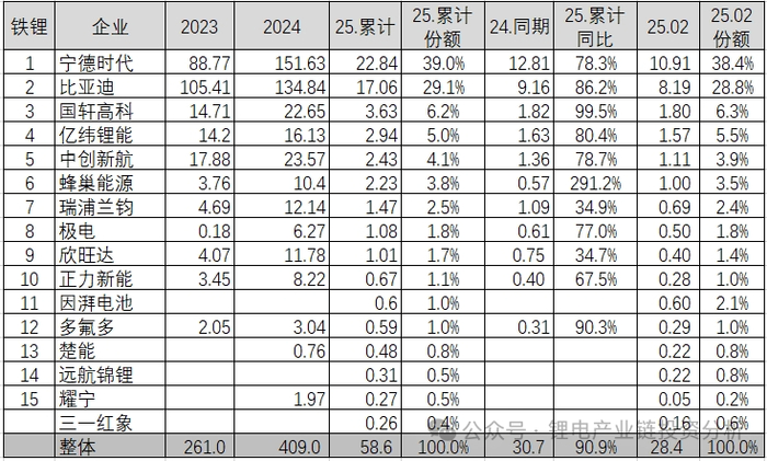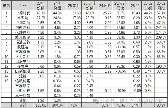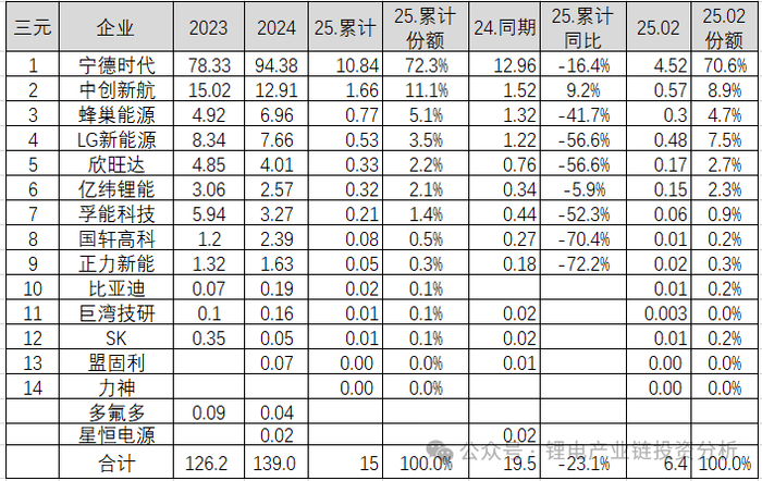 2025年3月11日动力电池联盟发布了2025年2月国内动力电池装机量数据,本文分析一下主要企业装机量情况:
