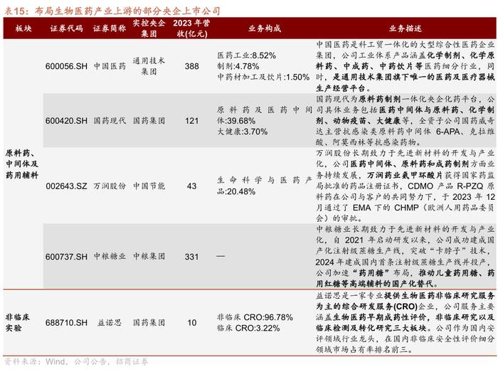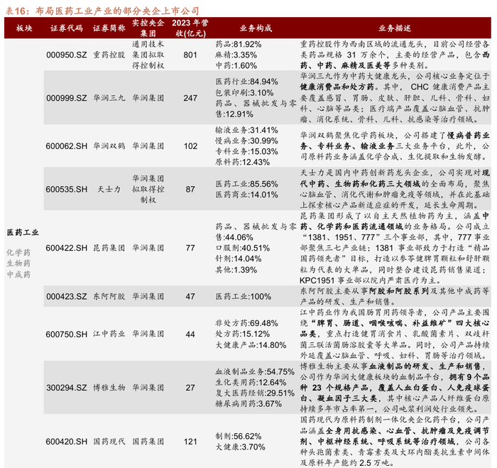 医药产业,华润集团、国药集团、通用技术集团三大央企旗下上市公司分别主导医药工业、医药商业和医疗健康领域。生物产业,丰乐种业和农发种业聚焦生物育种,中化化肥布局生物肥料。