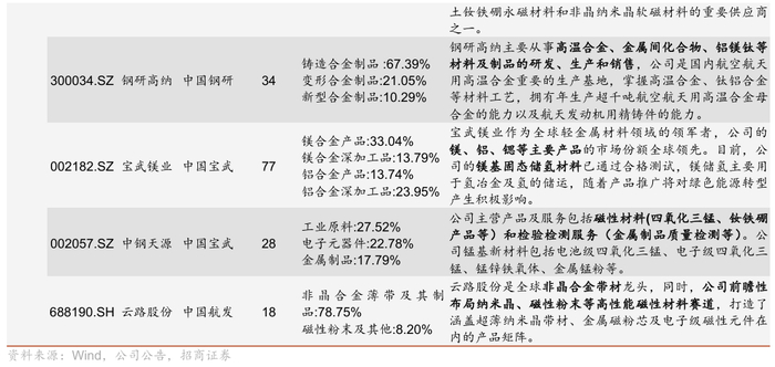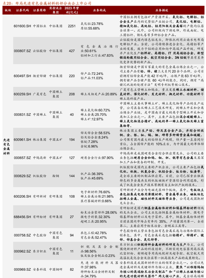 从产业环节上看,涉及先进有色金属材料的主要包括中铝集团、中国稀土集团、中国五矿、有研集团、中国钢研和中国有色集团下属上市公司。