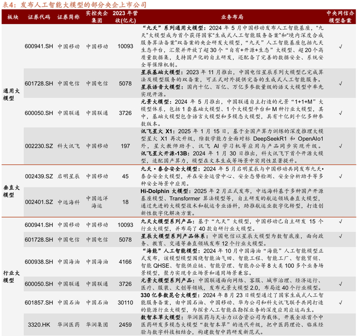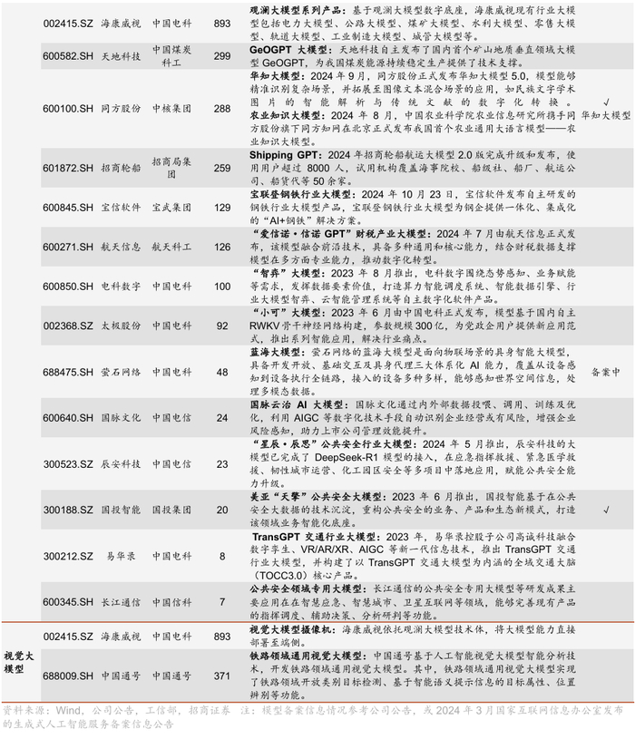 从产业环节来看,大模型建设的核心在于高质量数据支撑,而央企积累的丰富数据资源成为关键基础。其中,三大运营商担任通用大模型开发的主力军,多家央企依托主业优势深入行业大模型领域。目前,三大运营商均推出了各自的通用大模型和面向行业的专用大模型体系,且模型已通过中央网信办备案,即完成对模型开发标准、内容安全、数据主权等审查,可以向公众开放或者商用(非生成式人工智能或不具备舆论属性等大模型无需备案)。此外,宝信软件、海康威视、国投智能等多家央企上市公司围绕主业发布相关行业大模型。