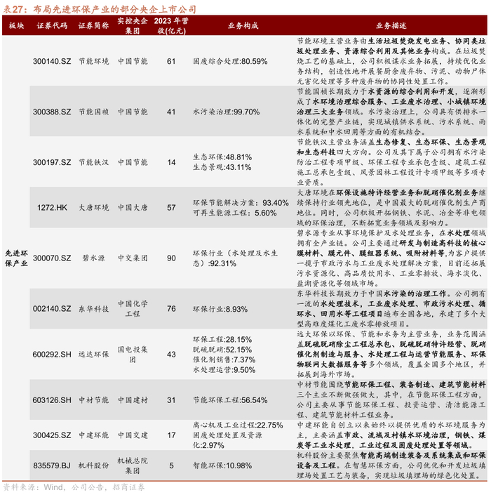 节能环保产业,能源、基建等央企均有相关布局。节能产业,国家电网和南方电网旗下上市公司率先开展能源管理;环保产业,中国节能、中国建材等央企集团下属上市公司业务覆盖固废处理、水污染等板块;资源循环上,中国资环集团及五家出资央企集团的旗下公司发展循环经济。