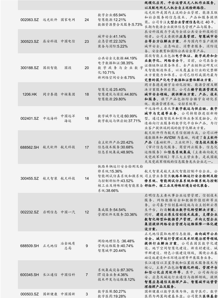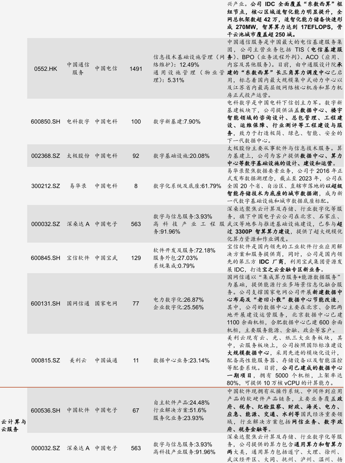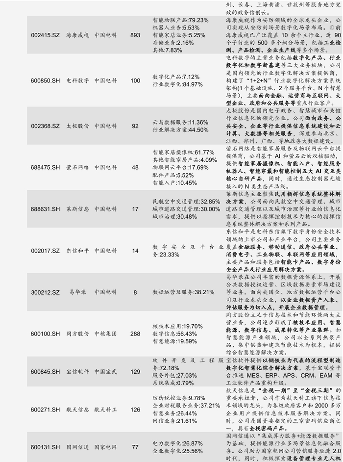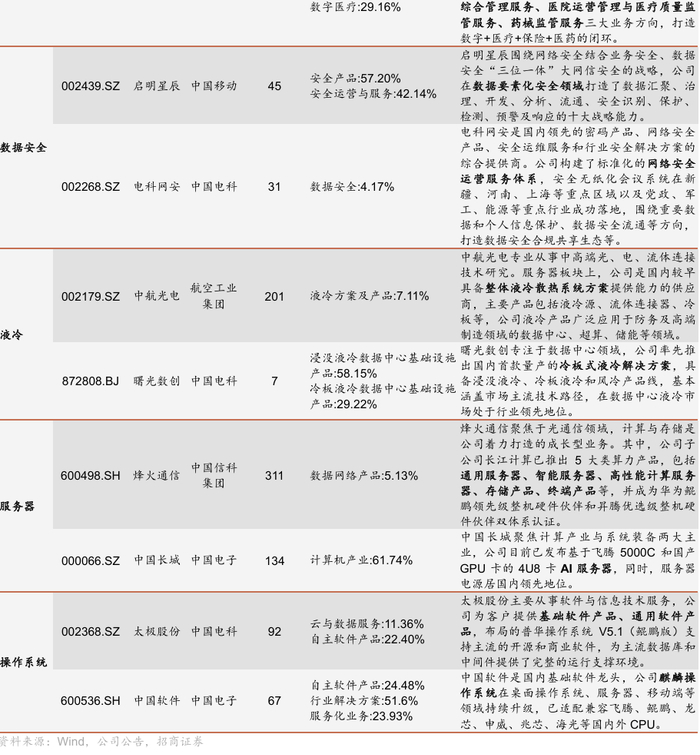 从产业环节来看,央企上市公司已形成从液冷技术、服务器、操作系统到智能计算中心的完整基建链条。其中,曙光数创作为数据中心液冷方案龙头,连续三年市占率第一;中国长城完成“芯端一体”布局,推出国产化智算中心解决方案。此外,央企以沉淀的丰富数据为基础,通过自建算力中心或租赁算力的方式,向政府、企业或个人提供SaaS、PaaS、DaaS服务以及智慧场景解决方案。如政企业务上,太极股份深度参与北京、江西等地的政务大数据建设;工业制造上,海康威视产品覆盖工业检测、产品检测等场景;个人业务上,萤石网络聚焦智能家居摄像机、智能入户、智能服务机器人等五大 AI 交互类产品。
