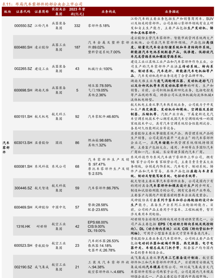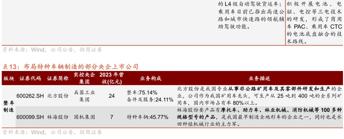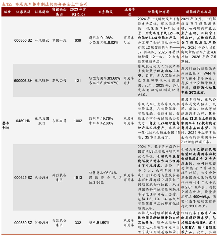 从产业环节上看,目前共有4家A股央企涉及整车制造,4家上市公司均展开对新能源和智能驾驶技术的应用研究。其中,东风股份由东风集团股份(0489.HK)直接持股,主要负责集团下商用车市场,是国内最早从事新能源示范运营、最早实现新能源商品化的企业;江铃汽车联合研发中国首个L4级自动驾驶货运车已投入使用。