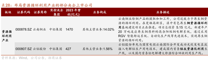 从产业环节上看,2024年中国资源循环利用集团正式成立,专司循环经济产业,同时,五家出资央企集团已布局循环产业。其中,中国宝武的再生资源业务主要集中在欧冶链金再生资源有限公司,公司已全面整合了中国宝武旗下钢铁生产基地的金属再生资源、汽车拆解、船舶拆解,以及再生钢铁的回收、加工等业务。中铝集团的铝和铜资源的循环产业分别布局在云铝股份和云南铜业。中国石化正在大力推进废塑料回收项目的研究与发展,2021年公司已牵头成立了塑料循环产业联合绿色行动联盟。此外,华润集团旗下的华润环保发展有限公司专注于环保科技领域,尤其在替代燃料业务方面表现出色。