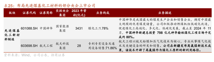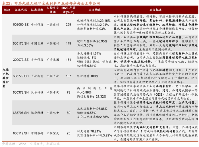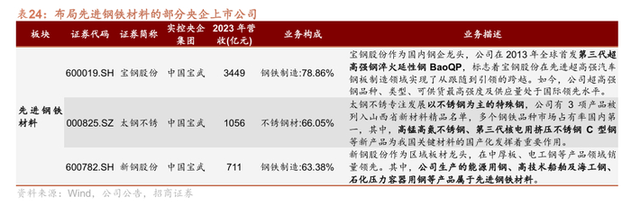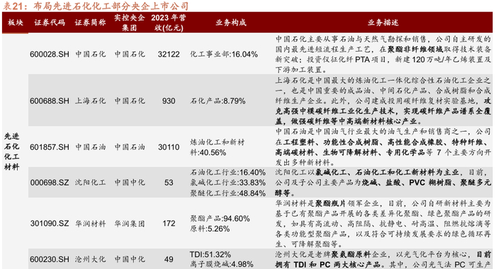 新材料产业,相关上市公司依托主业优势,延链布局前瞻产业,推进新材料发展。中铝集团等多家央企旗下上市公司聚焦先进有色金属材料;中国石油、中国石化主导先进石化化工材料;建材和化工企业深耕先进无机非金属材料;建材央企聚焦高性能纤维及复合材料;宝钢股份在先进钢铁材料研发领域取得关键突破;中国神华打造先进煤化工标杆项目。