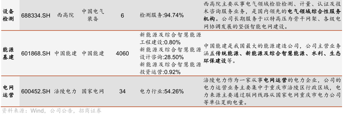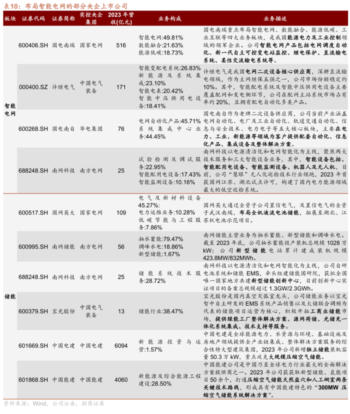 从产业环节上看,中国电气装备、国家电网和南方电网下属上市公司积极开展智能电网布局,包括发电侧和用电侧的储能系统、智能系统集成以及智能终端,同时,中国电建和中国能建等多家央企上市公司也在推进新型储能布局。其中,国电南瑞和南网科技引领我国电网数智化产业发展;南网储能下新型储能业务进入高速增长期。