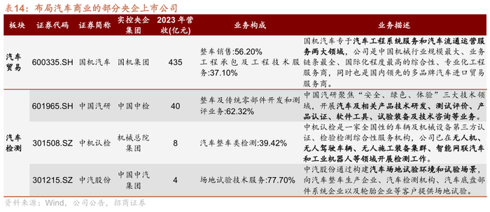 从产业环节上看,央企上市公司的汽车检测服务占据领先地位。其中,中汽股份作为汽车试验场领军企业,同时引领我国智能网联汽车检测的标准体系发展;中机认检拟新建智能应急装备检测产业园,进一步深化在无人装备检测领域的布局;中国汽研在新能源及智能网联业务提速,实现集团内部资源整合;以及国机汽车积极推进与新能源头部车企EPC合作模式。