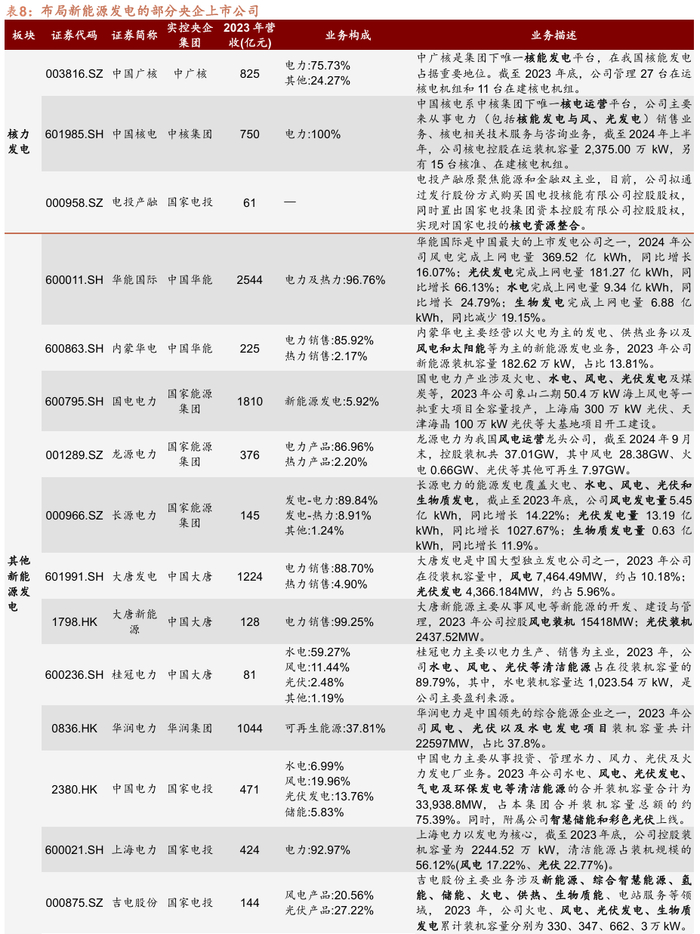 从产业环节上看,央企作为能源电力产业的主力军,旗下上市平台覆盖光伏发电、风电、核电、氢能等新能源发电领域,在发电环节具有较强的产业控制力。