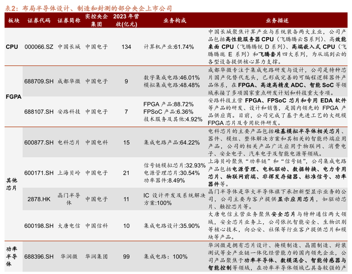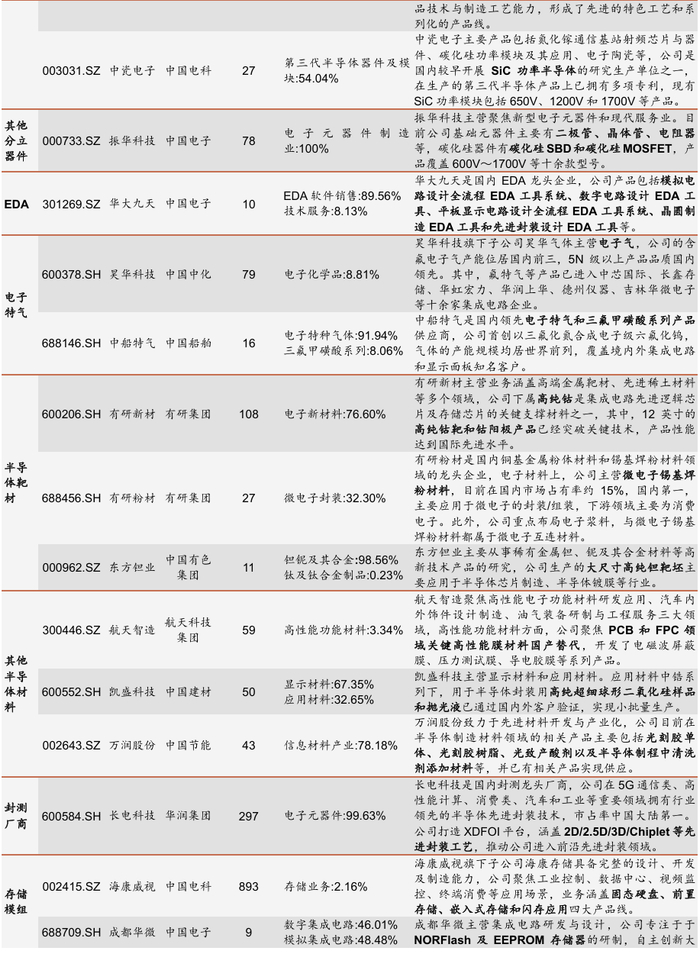 从产业环节来看,央企上市公司涉及布局半导体材料、设计等关键工艺节点。其中,EDA在集成电路产业中贯穿了设计、制造、封测等环节,华大九天作为国产EDA龙头,加速推动半导体行业自主可控;华润微实现功率半导体全产业链;中船特气是国内首个进入5nm制程的电子特气供应商,同时,电解氟化技术打破技术封锁;长电科技加速发展先进封装,在芯片封测领域排名世界第三。