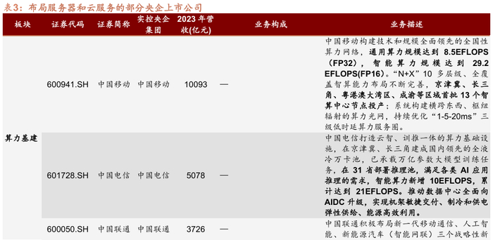 集成电路和人工智能产业,央企重点布局算力基建,依托数据资源优势拓展云服务及行业大模型开发。上游芯片制造,上市央企涉及布局半导体材料、设计等关键工艺节点;中游算力基建上,央企构建从液冷技术、服务器、操作系统到智能计算中心的全产业链,并通过自建/租赁算力中心拓展云服务;下游领域三大运营商担任通用大模型开发的主力军,多家央企也依托DeepSeek的AI开源生态和行业数据优势开发专属的行业模型。