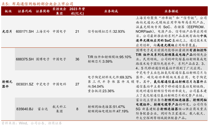 从产业环节来看,央企上市公司在无线通信和有线通信的元器件中均有布局。其中,上海贝岭围绕光通讯领域全面布局低速、高速光模块系列芯片;中瓷电子构建氮化镓基站射频芯片完整产业链加速国产化进程;国博电子在T/R组件及射频芯片领域形成军民两用市场领先优势;富士达则依托高频连接器技术优势,充分受益于新一代通信产业的发展。