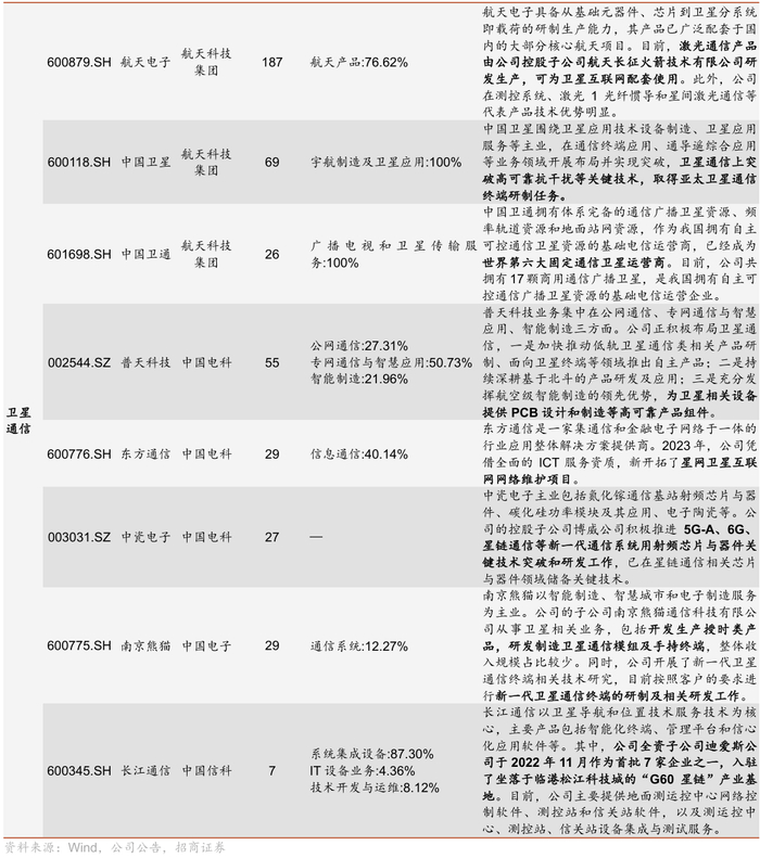 从产业环节来看,三大运营商终端运营上各有侧重,同时均展开卫星通信技术布局,中国卫通已经成为世界第六大固定通信卫星运营商。2024年,中国电信移动用户累计达4.25亿户,中国移动全年新增固网宽带用户领先,中国电信推出全球首创汽车直连卫星服务,此外,中国卫通是中国唯一拥有通信卫星资源且自主可控的卫星通信运营企业。