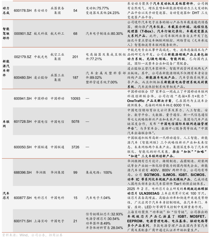 从产业链分布看,汽车零部件业务集中于兵器装备集团、航天科技集团及航空工业集团旗下上市公司;华润微、上海贝岭和电科芯片积极展开汽车芯片布局;三大运营商部分车联网系统已投入商业使用。其中,华润微已有56款车规级功率芯片实现量产;电科芯片自主研发的车规级达林顿驱动芯片ULN2003AG上车应用累计突破100万只。