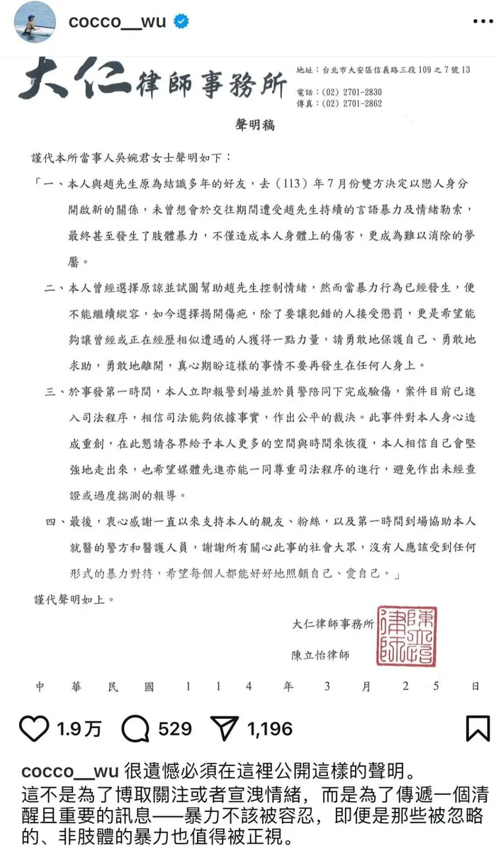 25日,吴婉君在社交媒体上晒出一张律师事务所声明,表示与赵骏亚一开始是好朋友,于2024年7月开始交往。在交往期间遭到对方言语暴力以及情绪勒索,最终引发肢体冲突,期间也曾选择原谅以及试图帮助男友控制情绪,但最终仍造成肢体上的伤害,因此决定说出自己的经历。