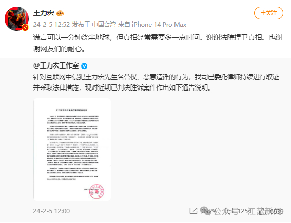 2024年2月5日,王力宏工作室在社交平台发布了一则《王力宏先生名誉维权案件胜诉说明》,随后,王力宏转发并配文:“谎言可以一分钟绕半地球,但真相经常需要多一点时间。谢谢法院捍卫真相。也谢谢网友们的耐心。”