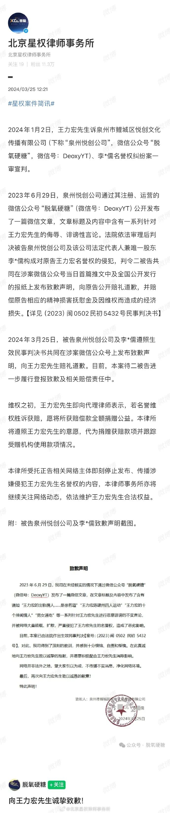 说明中称,法院于2024年1月2日作出判决,判令泉州悦创公司、李*儒应于判决生效之日起十日内共同在全国公开发行的报纸及涉案微信公众号“脱氧硬糖”当日首篇推文中发布致歉声明 ,向王力宏先生公开赔礼道歉,消除影响、恢复名誉(声明内容需经法院审核),并共同向原告王力宏先生赔偿精神损害抚慰金以及因维权而造成的经济损失。
