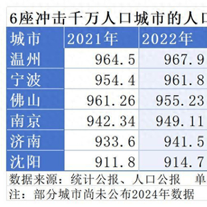 人口总量超过920万、最新公布人口数据年份(2023年或2024年)仍然保持人口增长的城市,一共有6座,包括温州、宁波、佛山、南京、济南和沈阳,他们保持着冲击千万人口城市的可能性。