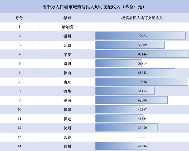 其次是超过7万元南京和温州,佛山、济南则在6万元以上的水平。在其余城市当中,合肥、沈阳的城镇居民人均可支配收入高于全国线(51821元),南阳的城镇居民人均可支配收入相当较低,为39814元。