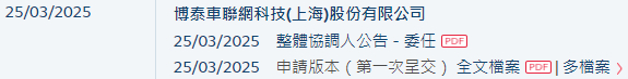 2025年3月25日,来自上海的博泰车联网科技(上海)股份有限公司 PATEO CONNECT Technology (Shanghai) Corporation(简称"博泰车联网”)在港交所递交招股书,拟在香港主板挂牌上市。这是继其于2024年6月28日递表失效后的再一次申请。