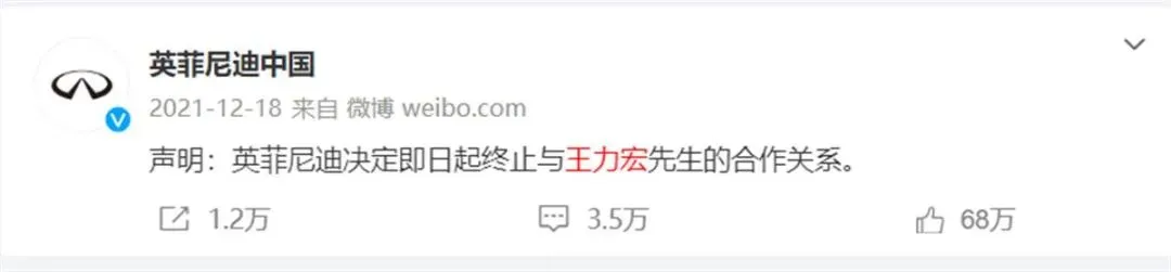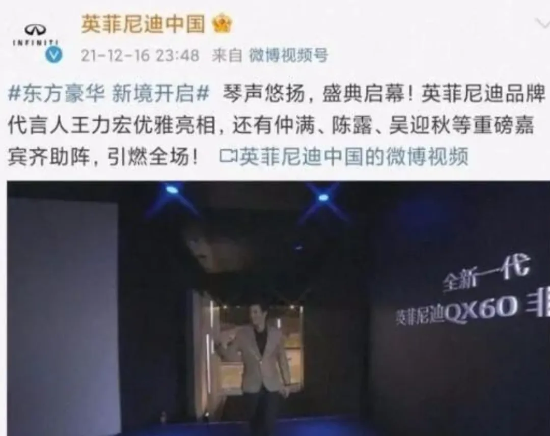 据21世纪经济报道,此前在2021年,英菲尼迪曾官宣王力宏为代言人,后续仅过去35小时就终止合同。