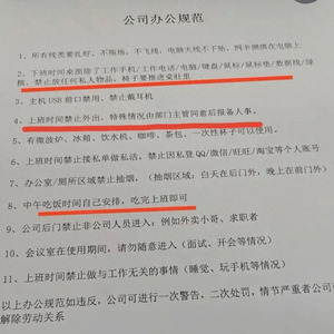 例如会议室椅子必须完全推入桌底,否则就会被开罚单,需要打扫卫生作为处罚;卫生间使用时间受限,人事部门定期巡查工位在岗情况。