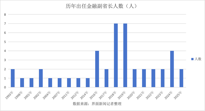 据界面新闻记者统计,上世纪90年代金融副省长就开始出现,截至目前一共产生了45位金融副省长,其中四分之三(34位)在2016年以后产生。