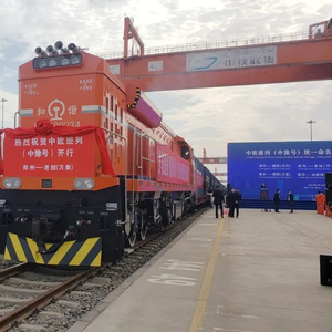 中豫港务集团充分发挥自身“通道 + 枢纽 + 网络”作用,实现中欧、中亚、俄罗斯、RCEP 区域国际班列“四线齐发”。图为郑州至老挝万象班列首发