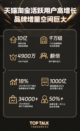 2025开年,淘宝天猫活跃买家数在10亿级基础上,仍迅猛增长,核心消费人群88VIP达到4900万,今年用户增长投入还将翻倍。目前,头部品牌集团在淘系年度活跃买家达千万量级,品牌增量空间巨大。