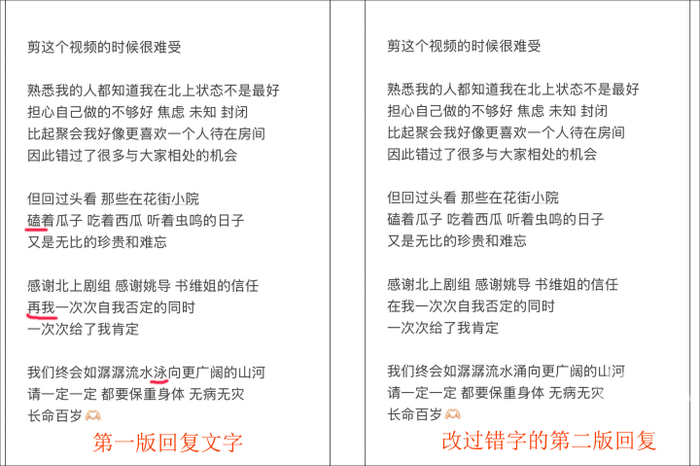 昨天(25日),该剧主演、于正公司签约艺人白鹿发微博告别自己的角色,并在评论区贴出了告别文。告别文里出现了多处错别字,将“嗑瓜子”打成了“磕瓜子”、“在”与“再”混淆、“涌”误写成“泳”。几分钟后,白鹿又贴出错字修改后的文章,但“磕瓜子”的错误仍未修改。