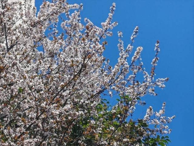 紫叶李花叶同生,一大片粉白的花朵中常常点缀着几片紫红的叶片,增加了紫叶李的辨识度。而樱花常常是先花后叶的,一树或粉嫩或洁白的花朵缀满整棵树梢,颇为壮观。不管是紫叶李还是樱花,都容易在春风拂面之时展现满树飞花的美景。现在,紫叶李已到花期末尾,取而代之的是不少早樱满树盛放,高大的染井吉野樱也蓄势待发,小小的蓓蕾俏立枝头。