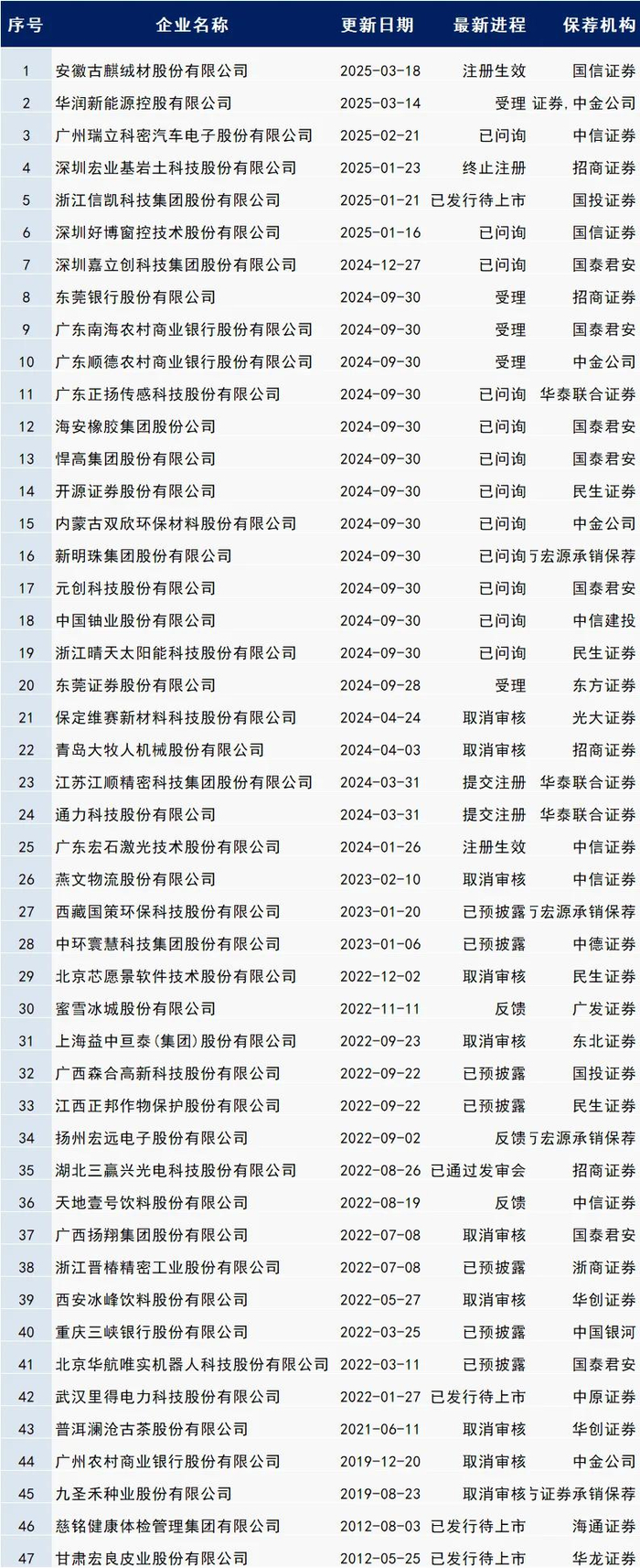 以下最新IPO进程中包含:已预披露、受理、已问询、已发行待上市、暂缓表决、中止审查、反馈、已通过发审会、提交注册、注册生效。