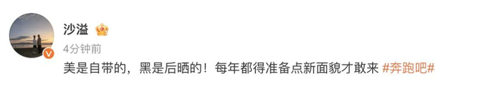 26日晚,@沙溢 发文回应热搜,称:“美是自带的,黑是后晒的!每年都得准备点新面貌才敢来。”