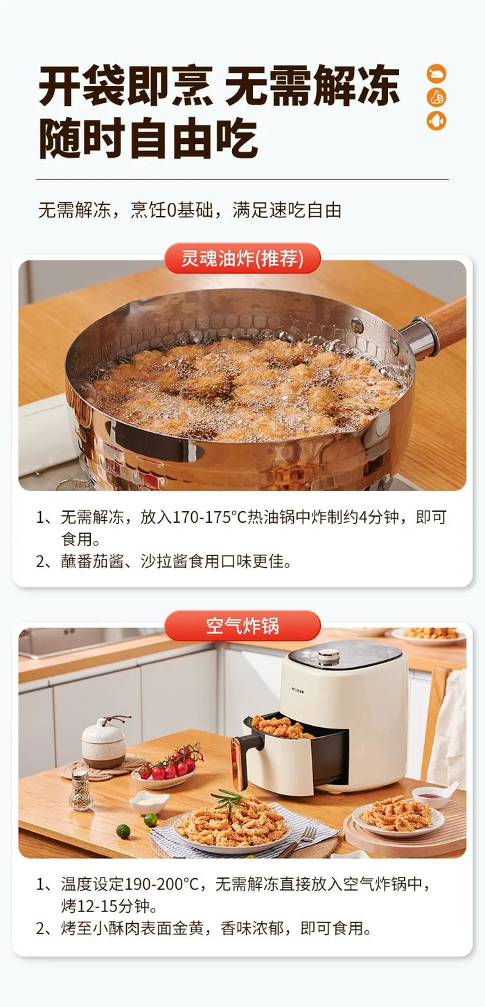 灵魂油炸:放入170-175°C热油锅中炸制4分钟,即可食用。搭配番茄酱、沙拉酱食用口味更佳~