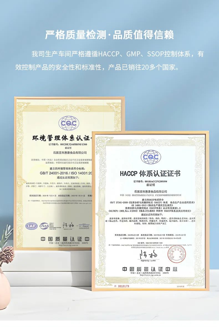 谷言源自石家庄市惠康食品有限公司,公司成立时间悠久,已发展20余年。严格遵循HACCP、GMP、SSOP质量控制体系,控制产品的安全性和标准性。