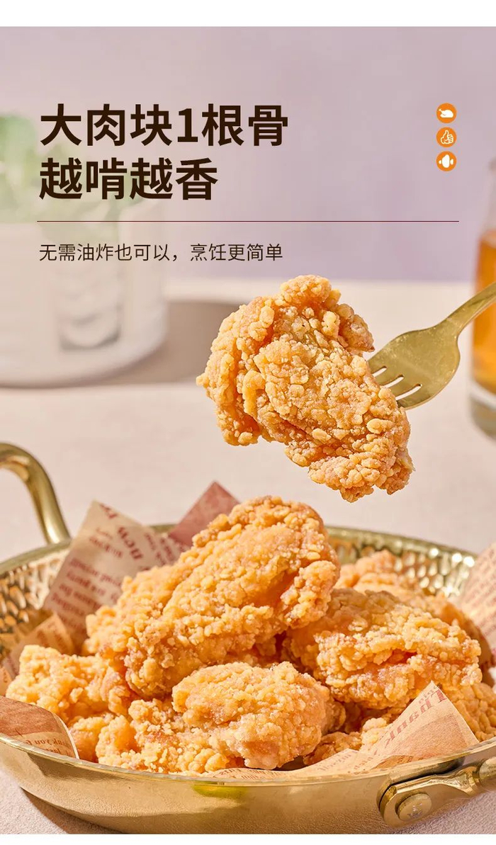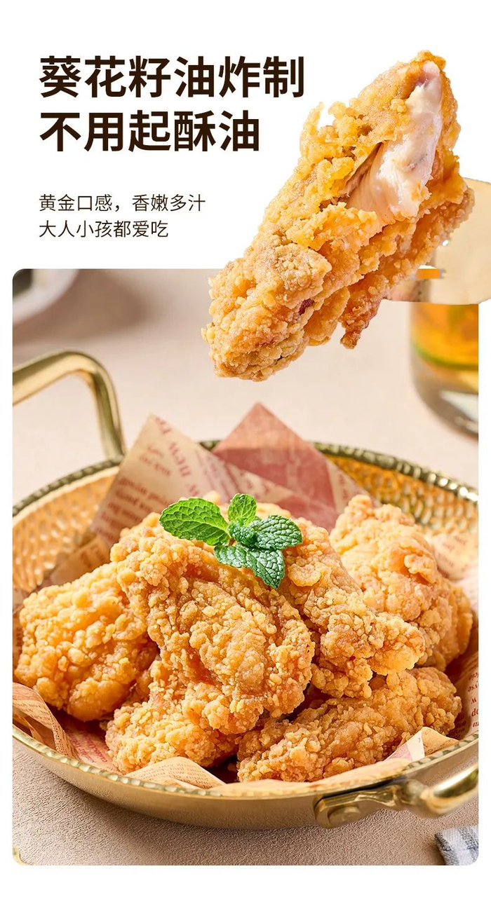 轻裹粉工艺,锁住鸡肉本身的营养和美味,炸制后外皮酥脆,色泽金黄,吮指难忘,好吃到停不下来~