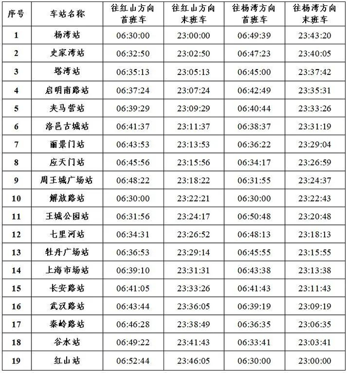 1号线首末班车时刻表
