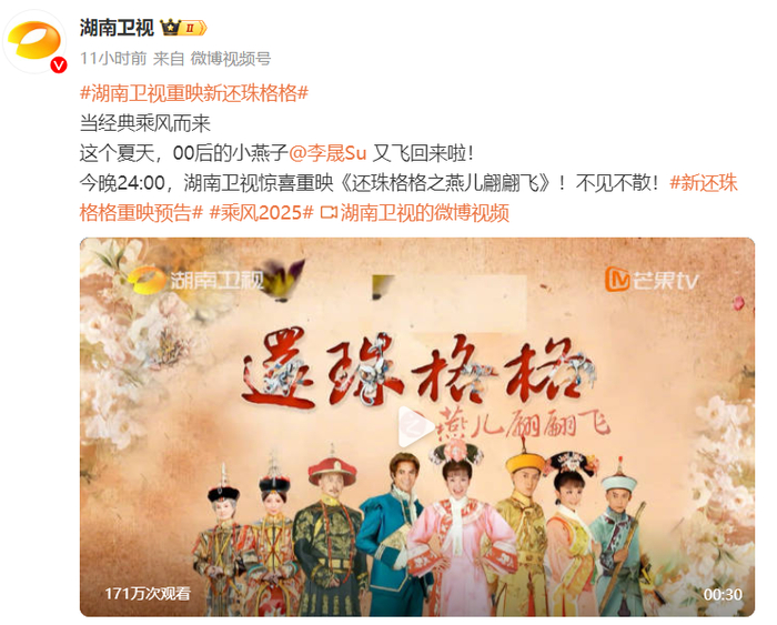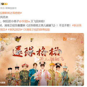湖南卫视官方微博写道:当经典乘风而来,这个夏天,00后的小燕子李晟又飞回来啦。今晚24:00,湖南卫视惊喜重映《还珠格格之燕儿翩翩飞》。不见不散。