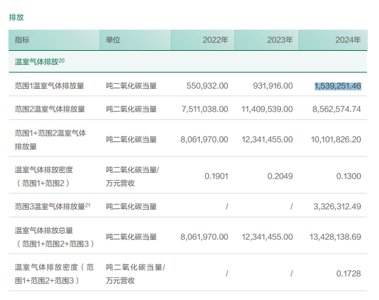 新能源、绿色是比亚迪的“标签”,2024年,比亚迪范围2温室气体排放量同比下降了25%。另外,温室气体排放密度(范围1+范围2)(单位:吨二氧化碳当量/万元营收)能够直观反映企业每创造1万元收入所产生的直接碳排放量,是评估企业“碳中和”进程中经济与环境效益平衡的重要指标之一。数据显示,2024年,比亚迪该数字为0.1300吨二氧化碳当量/万元营收,而2023年度为0.2049吨二氧化碳当量/万元营收,降幅明显。此外,比亚迪2024年首次披露了范围3碳排放。