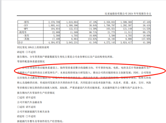 从那时起,比亚迪一步步从封闭走向开放。比亚迪的“开放”,一定程度上是“向外输出”自身的产品及能力,在汽车生产的主要产业链上,仍然依托自身的垂直整合能力带来的红利,比亚迪在2024年的年报中也坦陈了自身在垂直整合方面的优势。