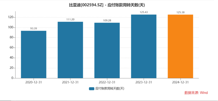 比亚迪财报显示,比亚迪应付账款合计超过了2400亿元,这一数字事关供应链上的13701家企业的未来。来自Wind的数据显示,2024年比亚迪应付账款周转天数为125.38天,与2023年的125.43天基本持平,而2020年,该数字为93.39天。