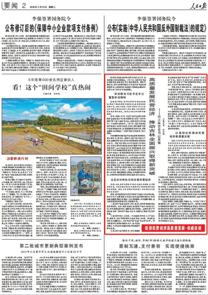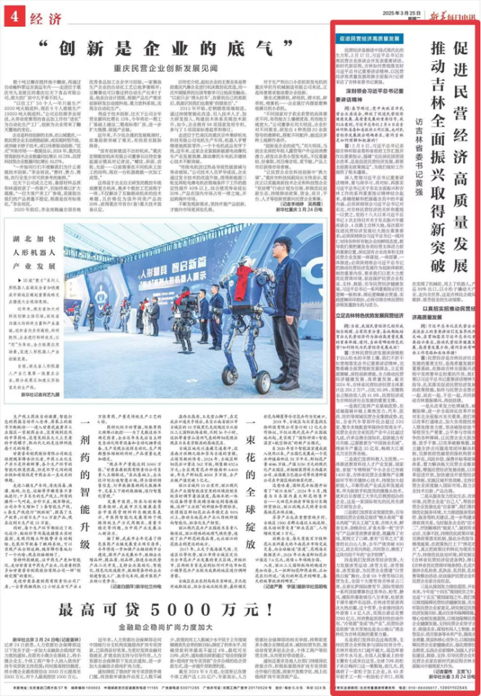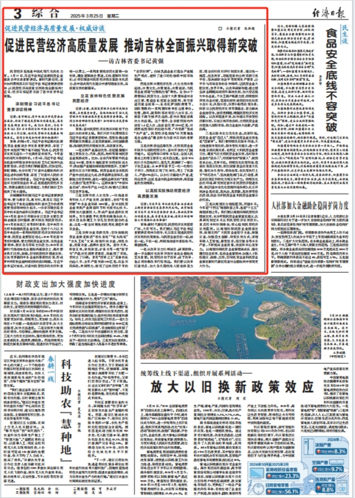 3月25日,人民日报、新华社、中央广播电视总台《新闻联播》、经济日报分别以促进民营经济高质量发展为主题,专访吉林省委书记黄强,围绕深刻领会习近平总书记重要讲话精神、立足吉林特色优势发展民营经济、以真招实招推动民营经济高质量发展三方面刊发报道。